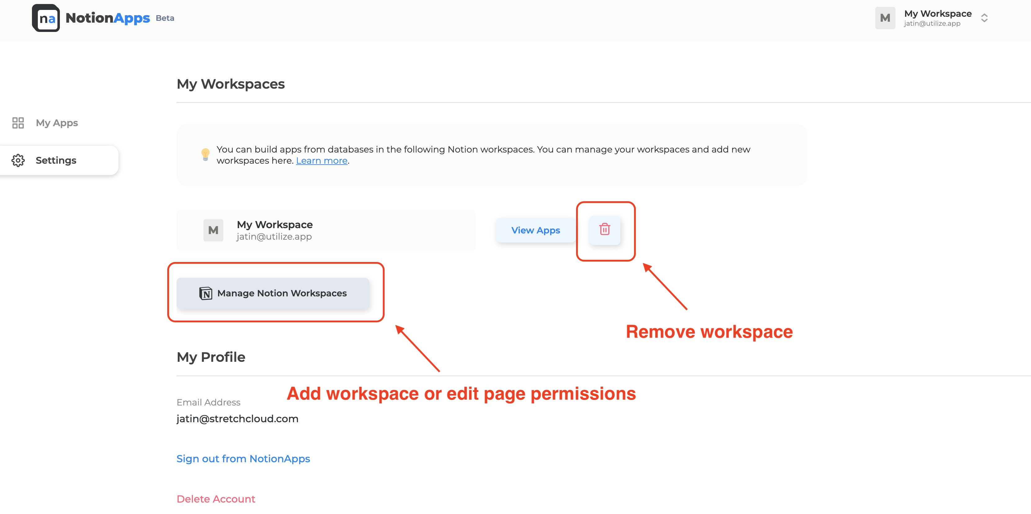4. To remove a workspace from NotionApps, click on the "Trash" button next to the workspace you want to remove.