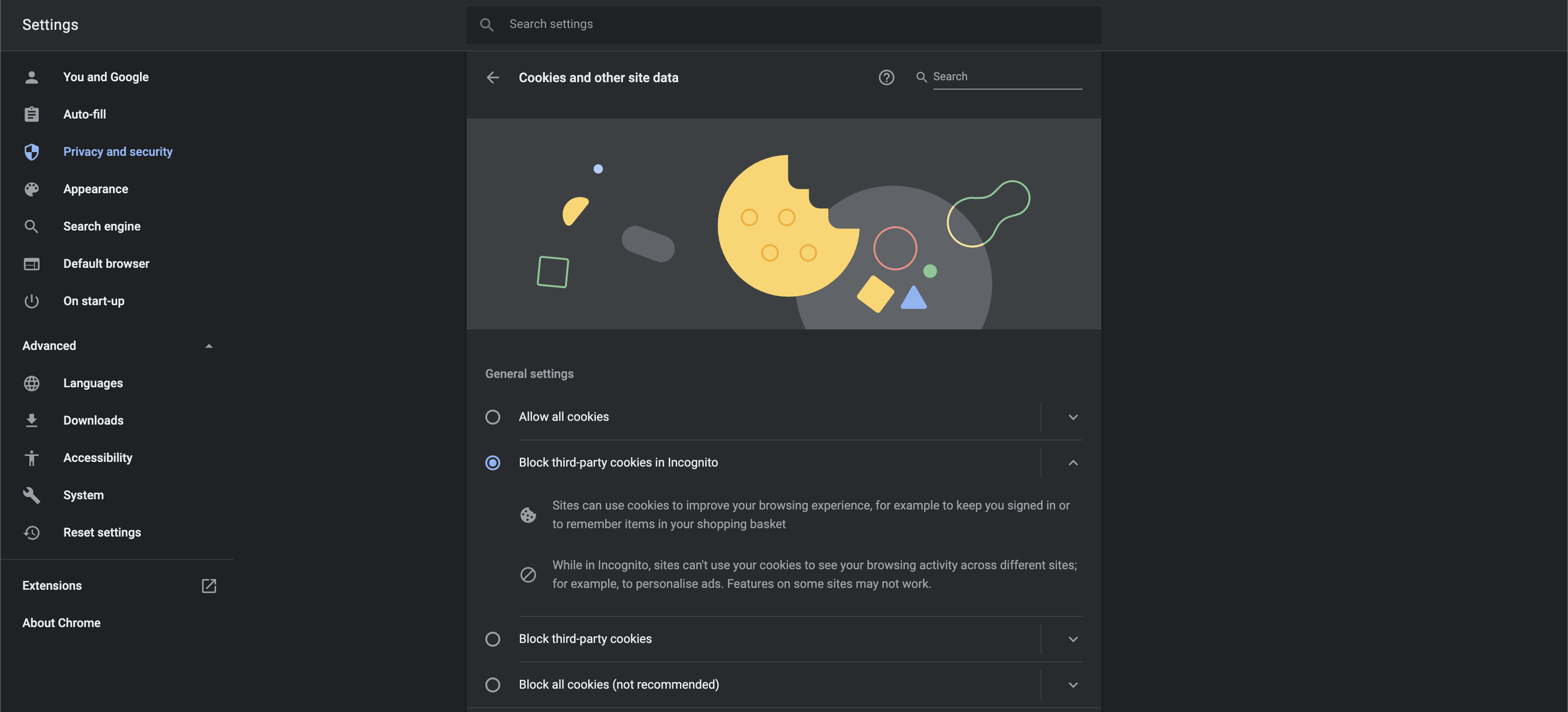 3. Select the option *Allow all cookies* or *Block third-party cookies* in Incognito.